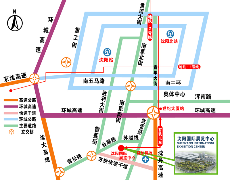 4、沈海高速(大連方向):沈海高速→沈陽方向→蘇家屯出口→雪松路→會展路→沈陽國際展覽中心