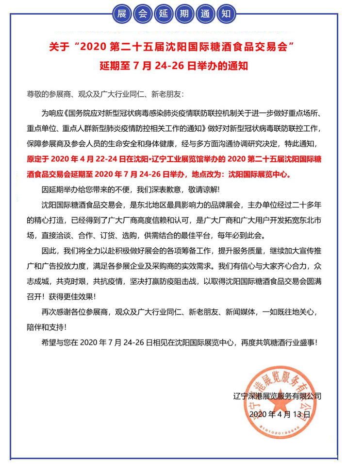 | 【重要通知】關于“2020第二十五屆沈陽國際糖酒食品交易會”延期至7月24-26日舉辦的通知 | |