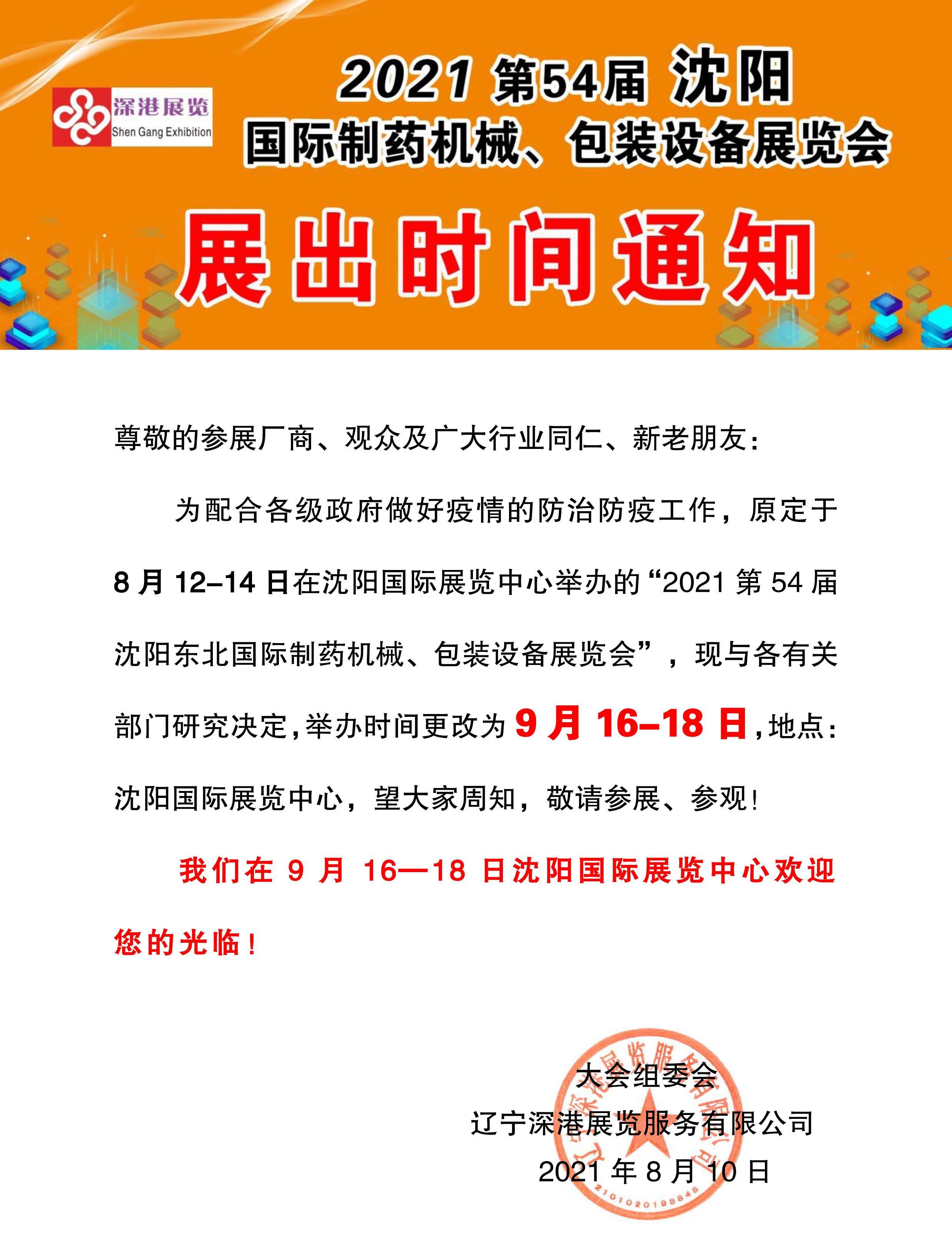 | 2021沈陽制藥機械展更改為9月16-18日在沈陽國際展覽中心舉辦?。?! | |