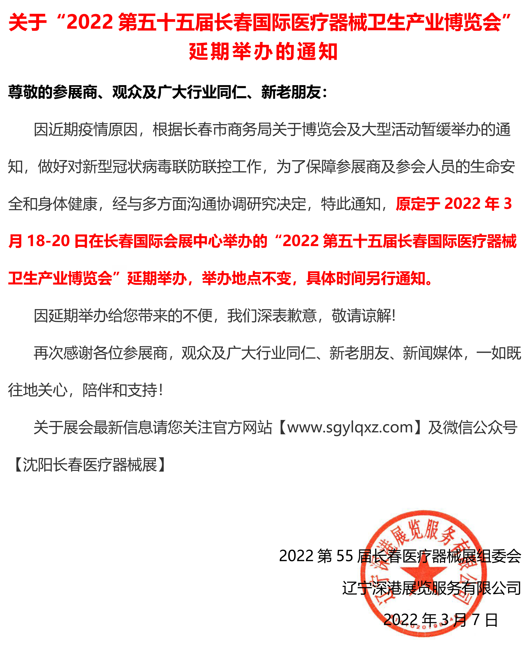 | 延期通知|2022第五十五屆長春國際醫(yī)療器械衛(wèi)生產(chǎn)業(yè)博覽會 | |