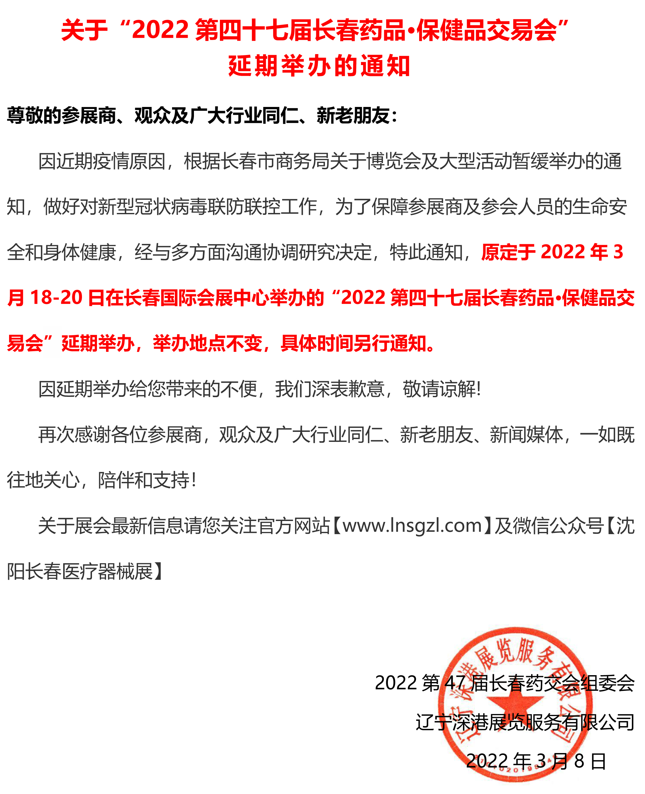 | 延期通知|2022第四十七屆長(zhǎng)春藥品·保健品交易會(huì) | |